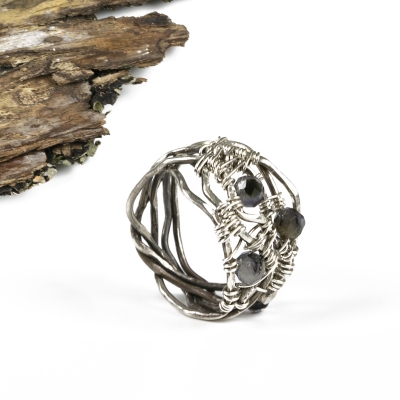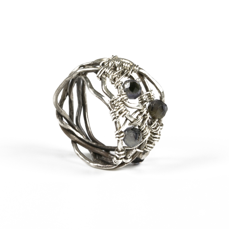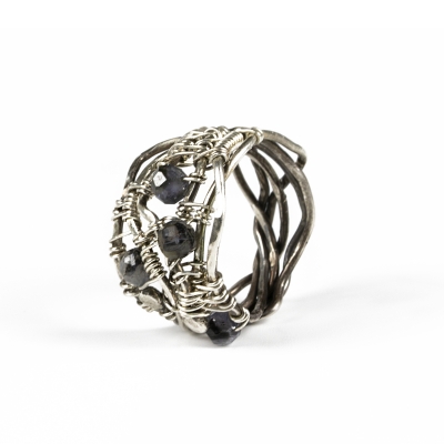 Sterling silver wire of varying gauges come together to create a woven pattern in this stunning ring. Delicate Iolite beads are woven within some gaps. Measures ring size 7. Liver of Sulfur is used to create an antique finish.