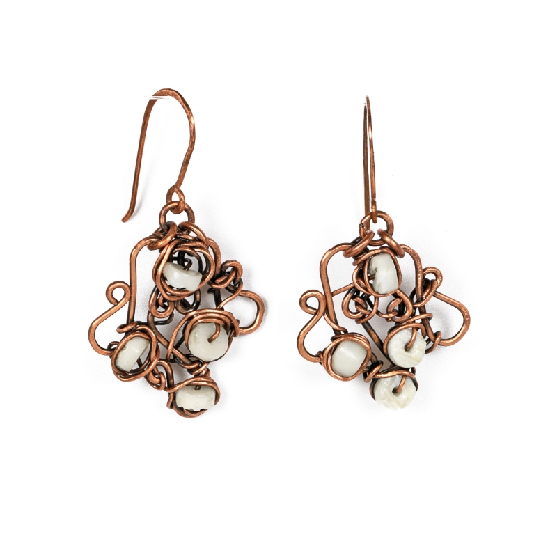 These copper hand-crafted earrings were created with the ocean as inspiration. Delicate white shell beads are adding beauty to this simple but elegant design. Measures 1 1/2' long. French wire. Liver of Sulfur is used to create an antique finish. The earrings are protected with a thin layer of ProtectaClear to prevent tarnishing.