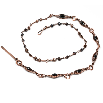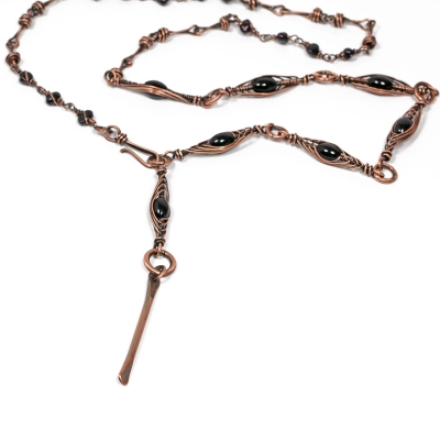 The long copper necklace is made from a variety of onyx gemstones and hand-made copper links. The clasp can be fastened to many different points, creating a new necklace each time––get creative! Necklace measures 30" L. Liver of Sulfur is used to create an antique finish. Protected with a thin layer of ProtectaClear to prevent tarnishing.
