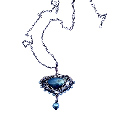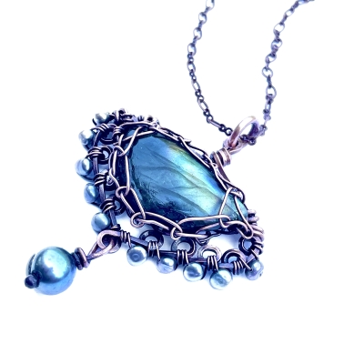 This beautiful handcrafted necklace is made from recycled copper wires. The necklace measures 21 inches long. The pendant is 2 inches long. Liver of Sulfur is used to create an antique finish. It is protected with a thin layer of ProtectaClear to prevent tarnishing.