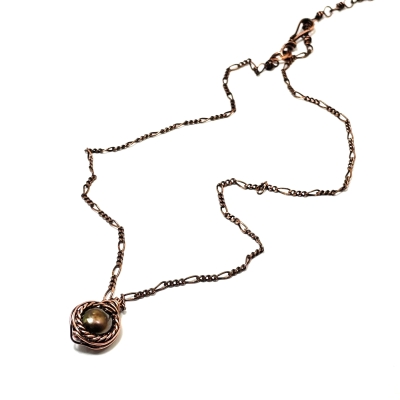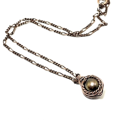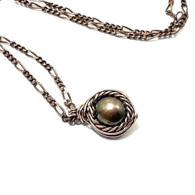 Hand-crafted, simple pearl necklace. The chain measures 20' long but can be adjusted to any shorter length. Liver of Sulfur is used to create an antique finish. Protected with a thin layer of ProtectaClear to prevent tarnishing.