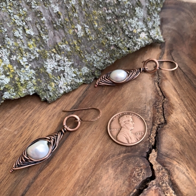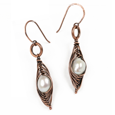 Handcrafted out of vintage wires. A singular white pearl is elegantly wrapped using a herringbone stitch. Measures 2'' long. French wires. Liver of Sulfur is used to create an antique finish. The earrings are protected with a thin layer of ProtectaClear to prevent tarnishing.