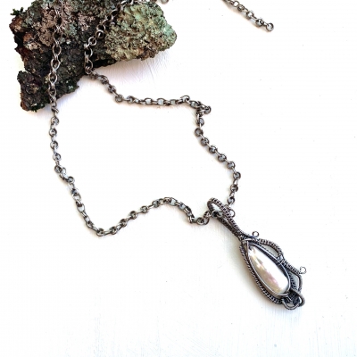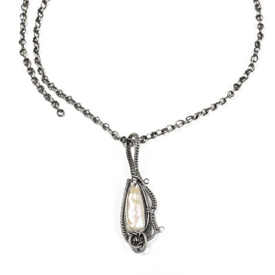 This necklace features a white, iridescent freshwater pearl hugged in handwoven 625 sterling silver wires and hand-coiled curls. Hand-crafted chain measures 23'' long but can be adjusted to any shorter length. The pendant dangles 2 1/2''. Liver of Sulfur is used to create an antique finish.