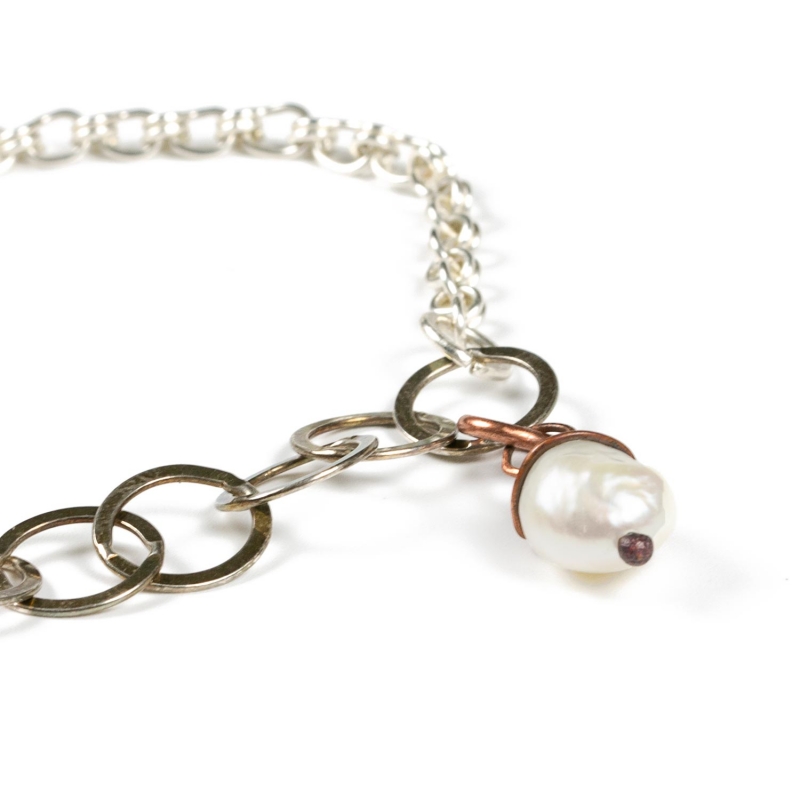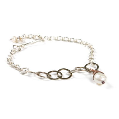 This asymmetrical bracelet is made out of Sterling Silver wires and chains with a single pearl hugged in vintage copper. Measures 9 and 1/2 inches long.