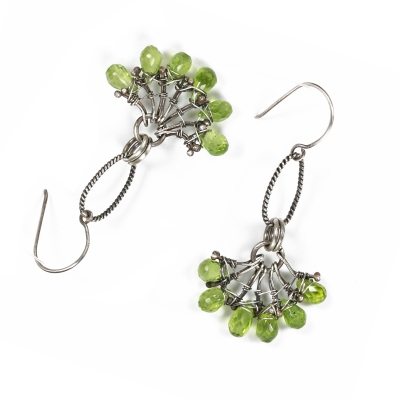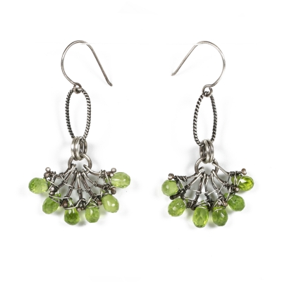 Hand-crafted with silver wires, six faceted peridot gems are held together in a simple wirework design. Earrings measure 2" long. French wires. Liver of Sulfur is used to create an antique finish.