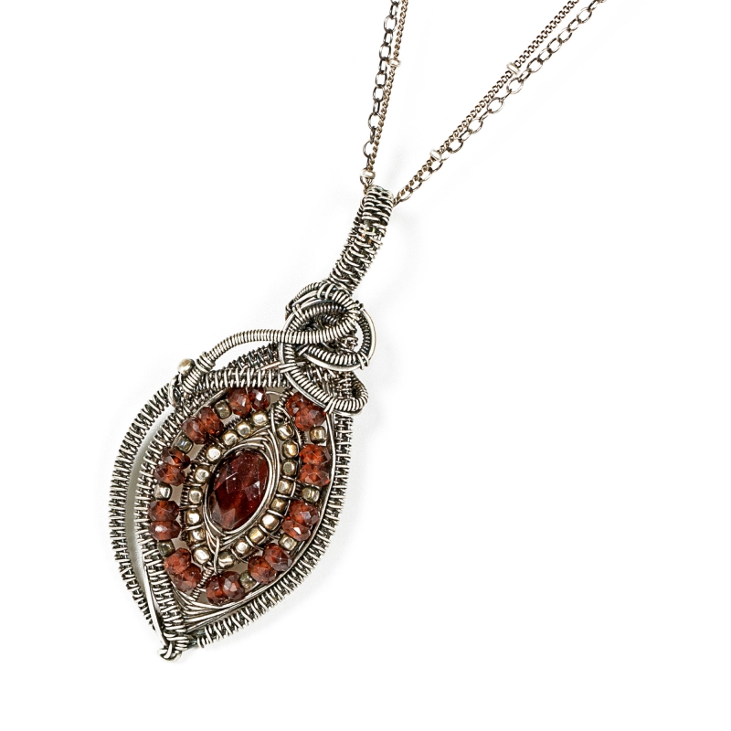 A hand-crafted centerpiece featured on a delicate two-strand silver chain. Inclusions of sterling silver seed beads and Garnet can be found woven within the leaf-shaped frame. Overall necklace measures 24" long but can be adjusted to a shorter length. The pendant measures 2 1/2" L. Liver of Sulfur is used to create an antique finish.