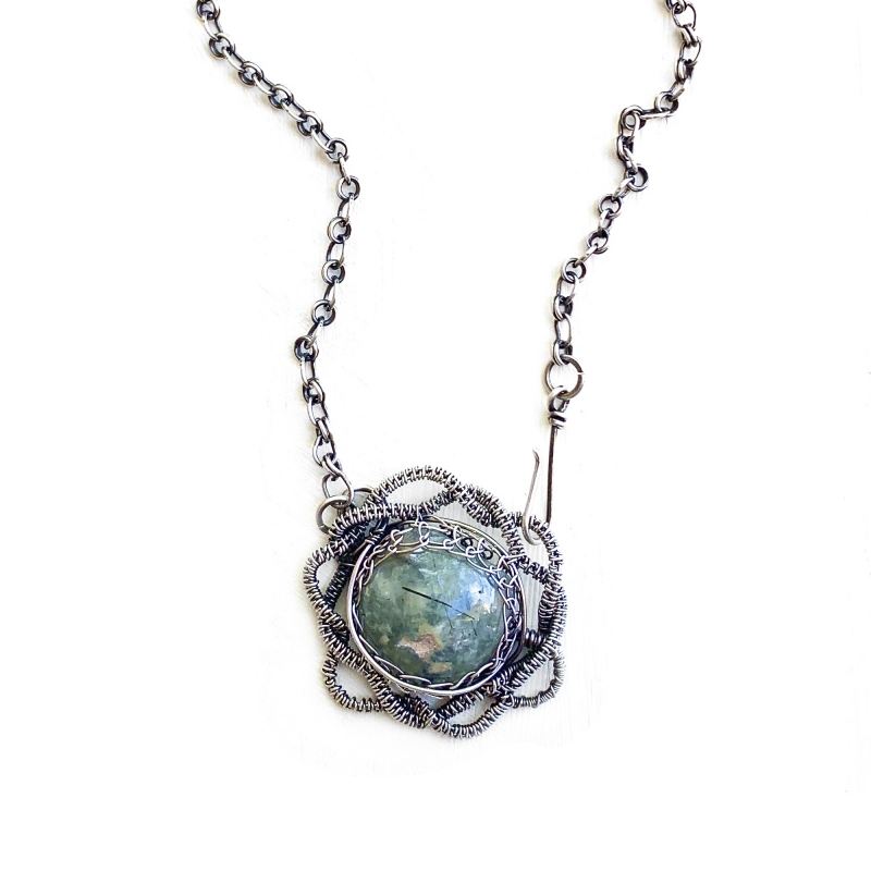 Hand-crafted silver chain, featuring a netted Prehnite cabachon. All componenets are hand done, included wired cables. Necklace measures 18 1/4", with our signature front clasp. Pendant measures 1 1/2". Liver of Sulfur is used to create an antique finish.