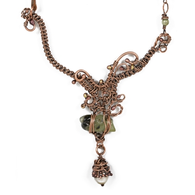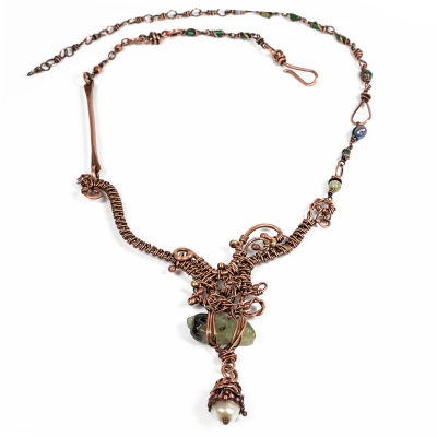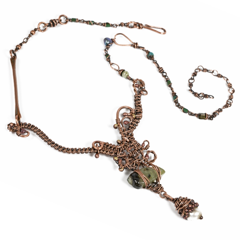 Handcrafted vintage copper chain, with inclusions of gemstones and hand-made copper links. The pendant is created with a variety of stitching and weaving, encasing a beautiful prehnite gemstone and white pearl. The necklace measures 20 1/2'' long. The middle component measures 3 1/2" x 3 1/2'' . Liver of Sulfur is used to create an antique finish. It is protected with a thin layer of ProtectaClear to prevent tarnishing.