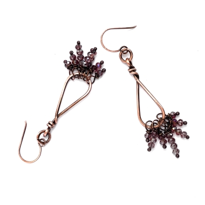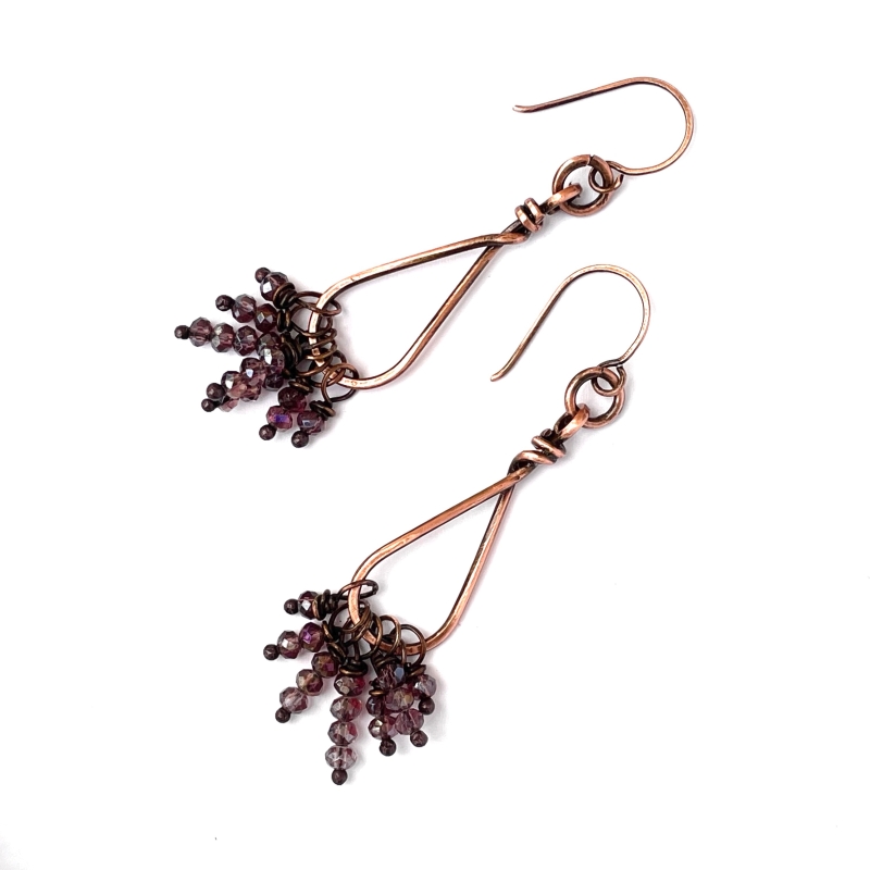 Created out of pure vintage copper wires and a cluster of small faceted glass purple beads. Measures 2 and a 1/2 inches long. French wire hooks. The Liver of Sulfur is used to create an antique finish. The earrings are protected with a thin layer of ProtectaClear to prevent tarnishing.