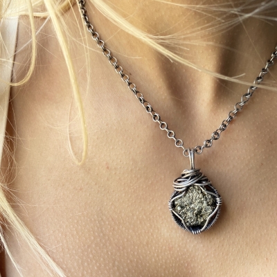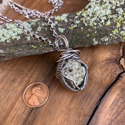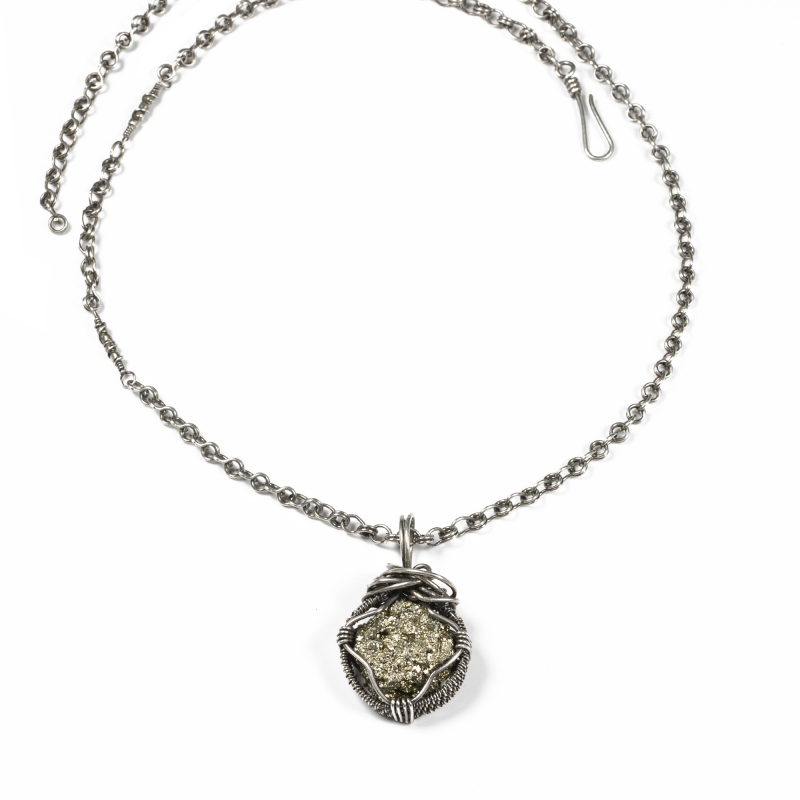 Hand-crafted silver chain, featuring a tightly-woven centerpiece. A circular pyrite stone is set into a simple wire wrapped pendant, creating a piece that can truly be worn for any occasion. Necklace measures 23 1/2'' long but can be adjusted to any shorter length. Pendant measures 1 1/2'' long. Liver of Sulfur is used to create an antique finish.