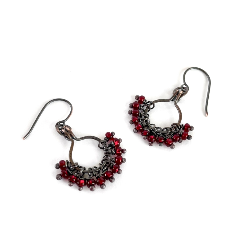 Created out of pure oxidized vintage copper wires and twelve small red seed beads. Measures 1 and a 1/2 inches long. French wire hooks. The Liver of Sulfur is used to create an antique finish.
