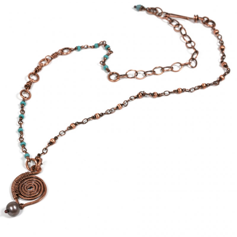 This simple necklace was created with hand-made copper chains and a swirl pendant, featuring one freshwater pearl. A few copper components add variety to the piece, including a few colorful seed beads for a pop of color. The necklace measures 19'' long, but can also be shortened to any other length. Liver of Sulfur is used to create an antique finish. It is protected with a thin layer of ProtectaClear to prevent tarnishing.