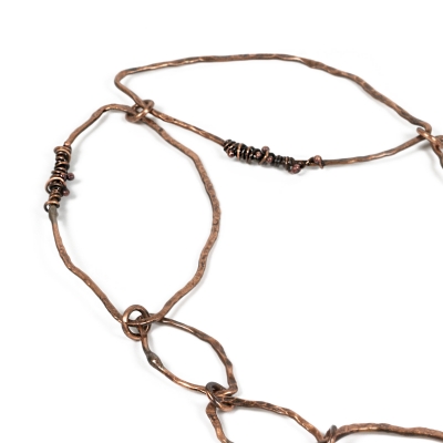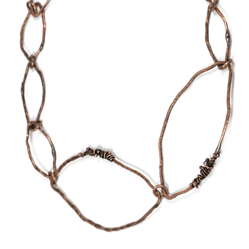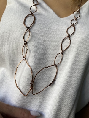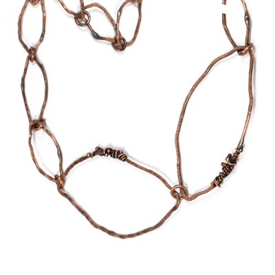 This simple necklace is hand-crafted from a pure vintage copper wire. Each link is soldered and formed by hand, later texturized. There is no clasp, though the necklace is long enough to fit all. Necklace measures 39" L. Liver of Sulfur is used to create an antique finish. Protected with a thin layer of ProtectaClear to prevent tarnishing.