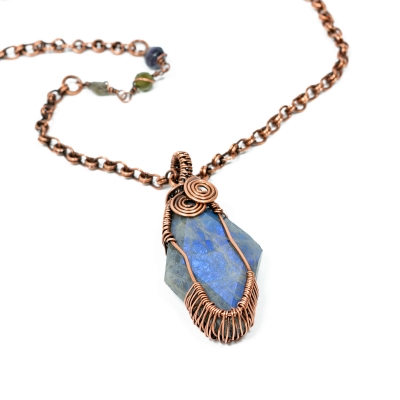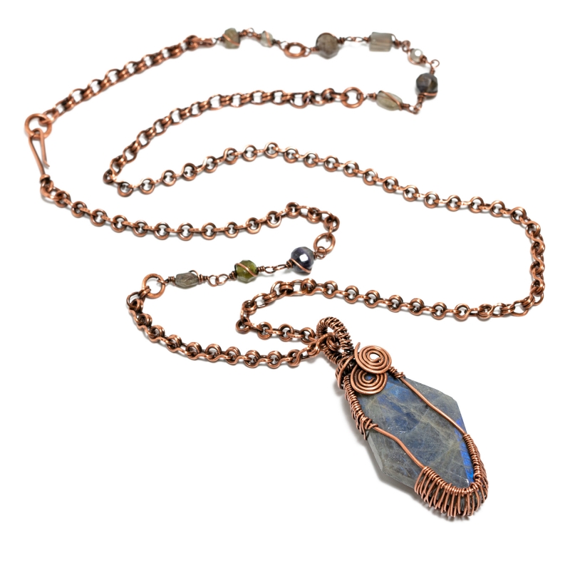 Handcrafted vintage copper chain, with inclusions of a variety of labradorite gemstones and hand-made copper links. The cabochon pendant was created by hand-wrapping thinner gauges to create a netted style, encasing a beautiful rhombus Labradorite stone. The necklace measures 31 1/2'' long. The pendant is 2 1/2" long. Liver of Sulfur is used to create an antique finish. It is protected with a thin layer of ProtectaClear to prevent tarnishing.
