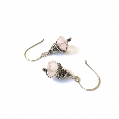 Handcrafted out of sterling silver wire and hand-faceted rose quartz. Simple wrapping perfect for an everyday pair of earrings. Measures 1 and 1/3 inch long. French wire. Liver of Sulfur is used to create an antique finish.