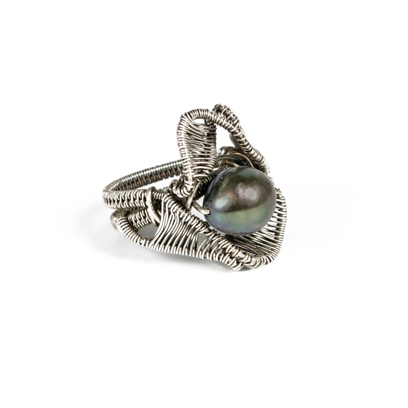 Handcrafted out of sterling silver wires, this ring combines delicate wire-weaving with an abstract design. A beautiful grey freshwater pearl is held securely in the center. Measures ring size 5 1/2. Liver of Sulfur is used to create an antique finish.