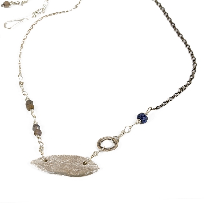 This nature-inspired piece was one of my first creations with precious metal clay. The centerpiece is actually molded from a leaf I nipped off of my sage plant. Necklace measures 20" L. Liver of Sulfur is used to create an antique finish.