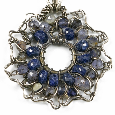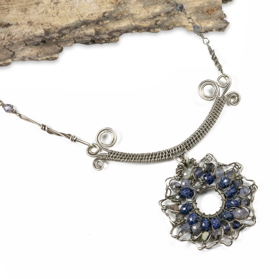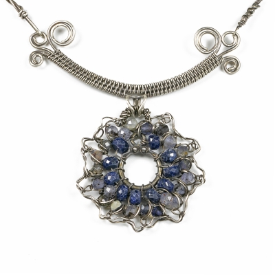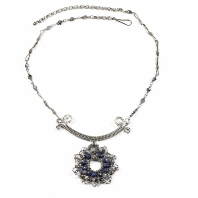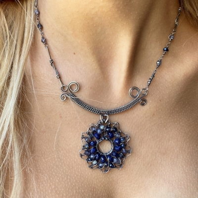 This necklace contains a Sapphire sunflower pendant that dangles from a delicately woven component. The pendant holds 32 sparkly faceted Saphhire beads. The necklace finished with handcrafted elements and chain. 20 and a 1/2 inches long but can be adjusted to any shorter length. Liver of Sulfur used to create an antique finish.