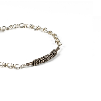 This simple chain bracelet is made out of Sterling Silver wires and chains, featuring a curved hand-made silver bead. Measures 8 and 3/4 inches long, but can be adjusted to any shorter length. Perfect for everyday use or to jazz up a simple outfit!