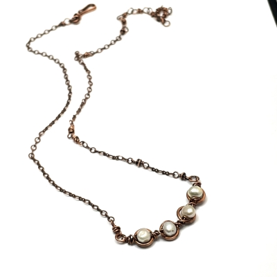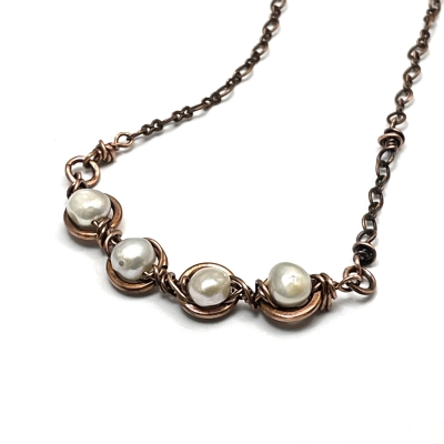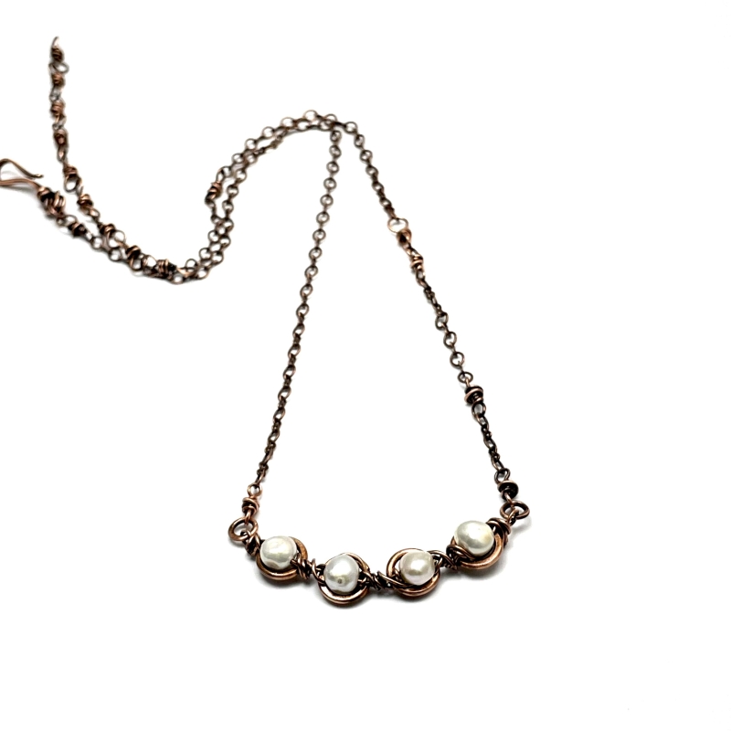This necklace features a beautifully crafted middle element, comprised of clusters of four pearls. The chain measures 21 1/2'' long but can be adjusted to any shorter length. Liver of Sulfur is used to create an antique finish. Protected with a thin layer of ProtectaClear to prevent tarnishing.
