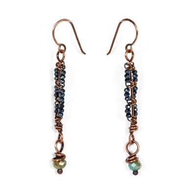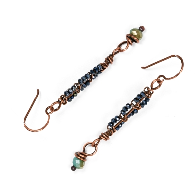 Handcrafted pure copper earrings, created out of vintage wires and sparkly black glass beads. Measures 2 1/2''long. French wires. The earrings are protected with a thin layer of ProtectaClear to prevent tarnishing.