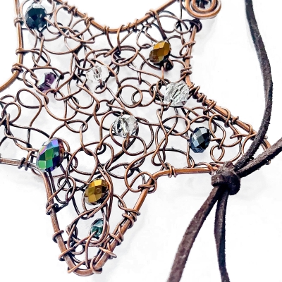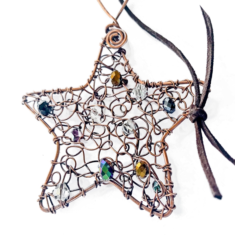 This star ornament ​is hand-crafted out of vintage copper wire. The body of the ornament is decorated in an abstract way, with multiple gemstones and copper wire. Protected with a thin layer of ProtecaClear to prevent tarnishing.