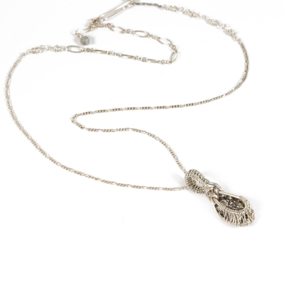 This simple design was created completely out of silver––even the middle cabochon. The pebble inside is actually pure sterling silver, melted and texturized by hand. The necklace measures 21 1/2" long, but the chain could be shortened to any shorter length. You can wear this necklace on either side, one is shown on the main page, the other on the model.