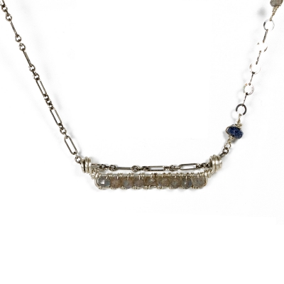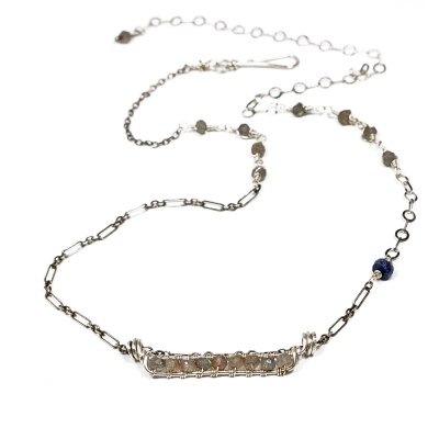 This necklace features a beautifully crafted silver component with 9 small Labradorite stones wire wrapped in a row. The chain also includes a Sapphire stone set in the chain. The middle part measures 4" long. The necklace measures 22" long, but can be adjusted to any shorter length, bar component measures 1 3/4" L.