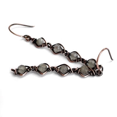 Simple nature-inspired earrings made out of pure copper wire and labradorite. Measures 2 inches long. French wire. Liver of Sulfur is used to create an antique finish.