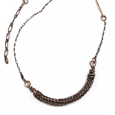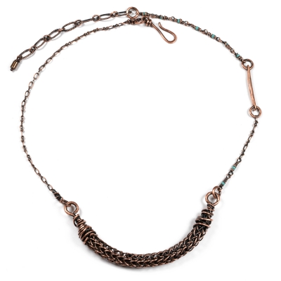 This simple piece was hand-crafted from vintage copper wire, featuring a knitted centerpiece. Bried inclusions of blue seed beads add a pop of color within the chains. The centerpiece measures about 3'' long, and the necklace measures 19'' L. Liver of Sulfur is used to create an antique finish. Protected with a thin layer of ProtectaClear to prevent tarnishing.