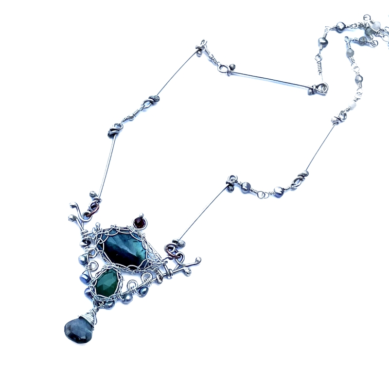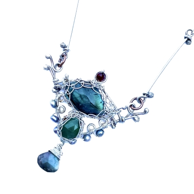 This netted piece was inspired by unique and colorful vintage jewelry, featuring a rosary link silver chain with inclusions of various stones to attract wealth and prosperity (Garnet and Pearls) and Manifestation( Labradorite). It measures 20 inches long but could be adjusted to a shorter length. The necklace measures 20'' long, but can be adjusted to a shorter length.