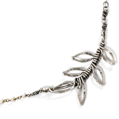 This everyday piece combines delicate Sterling Silver chains, delicate freshwater pearls, and a texturized branch component. The centerpiece measures almost 2'' long, and the necklace measures 21'' long but can be adjusted to a shorter length.