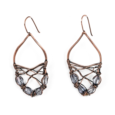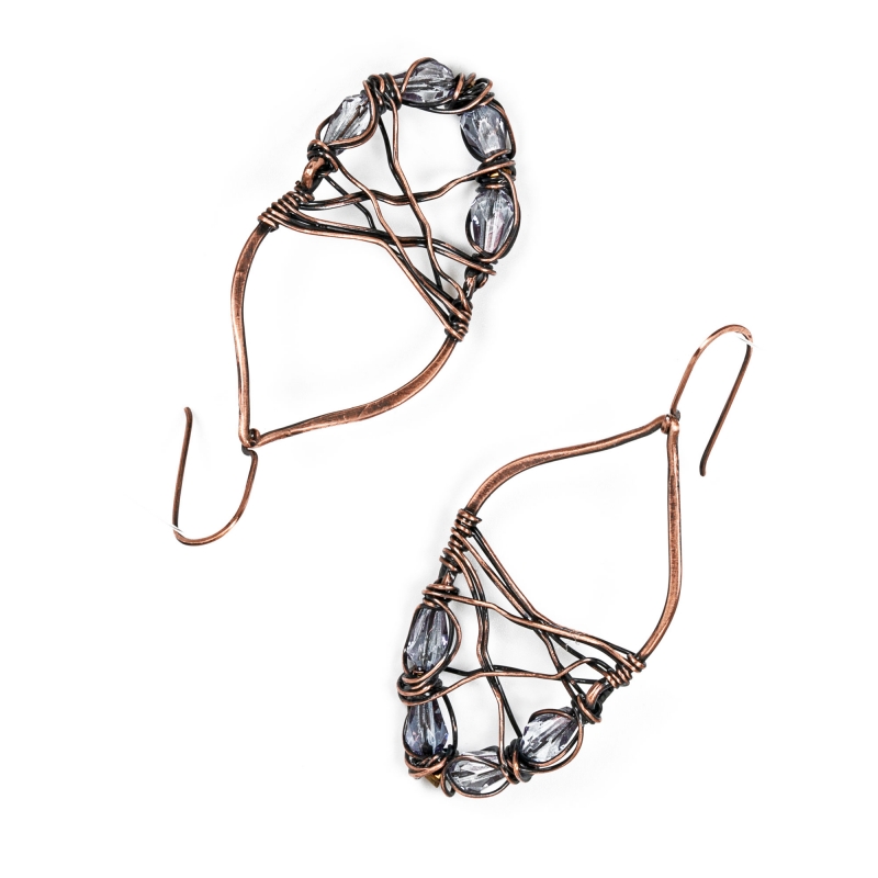 These earrings are handcrafted out of old vintage wires which makes them ideal for any outfit. The lower component is handwoven into an elegant basket-weave with four light purple glass beads. Lightweight. Measures 2 1/2" long. French wires. Liver of Sulfur is used to create an antique finish. The earrings are protected with a thin layer of ProtectaCear.