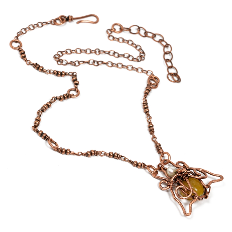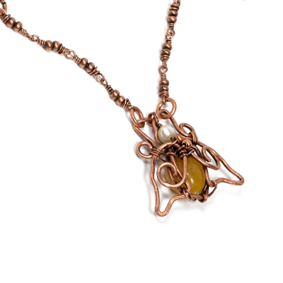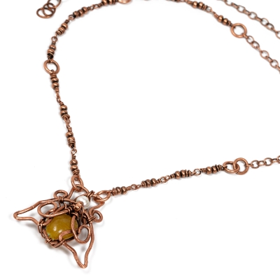 Handcrafted vintage copper chain with a centerpiece that is hand-made and woven to create a delicate bumblebee in the center. The necklace measures 21" long. The centerpiece is about 1'' long. Liver of Sulfer is used to create an antique finish. Protected with a thin layer of ProtectaClear to prevent tarnishing