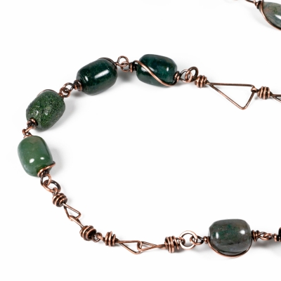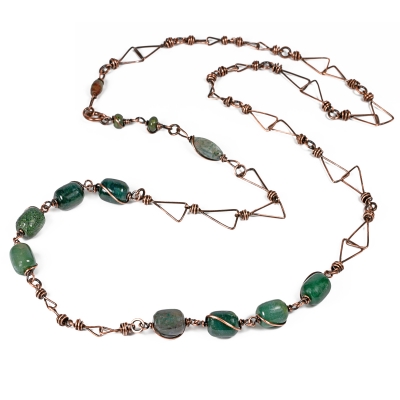 This simple necklace is hand-crafted from a combination of vintage copper wires and jasper stones. The design features hand-made triangular chains, or zig-zags. There is no clasp, though the necklace is long enough to fit all. Necklace measures 40" L. Liver of Sulfur is used to create an antique finish. Protected with a thin layer of ProtectaClear to prevent tarnishing.