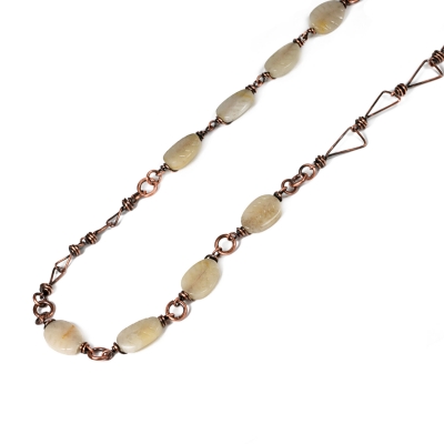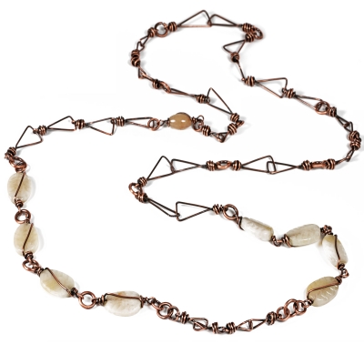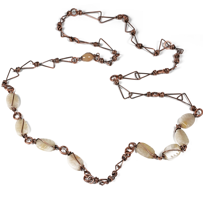 This simple necklace is hand-crafted from a combination of vintage copper wires and jasper stones. The design features hand-made triangular chains, or zig-zags. There is no clasp, though the necklace is long enough to fit all. Necklace measures 40" L. Liver of Sulfur is used to create an antique finish. Protected with a thin layer of ProtectaClear to prevent tarnishing.